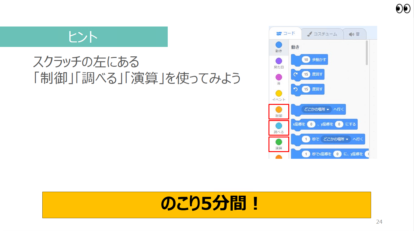 ヒントを伝えながら、後半はハンズオンメインで頭を使い、手を動かし実際にプログラム処理を作っていきます。