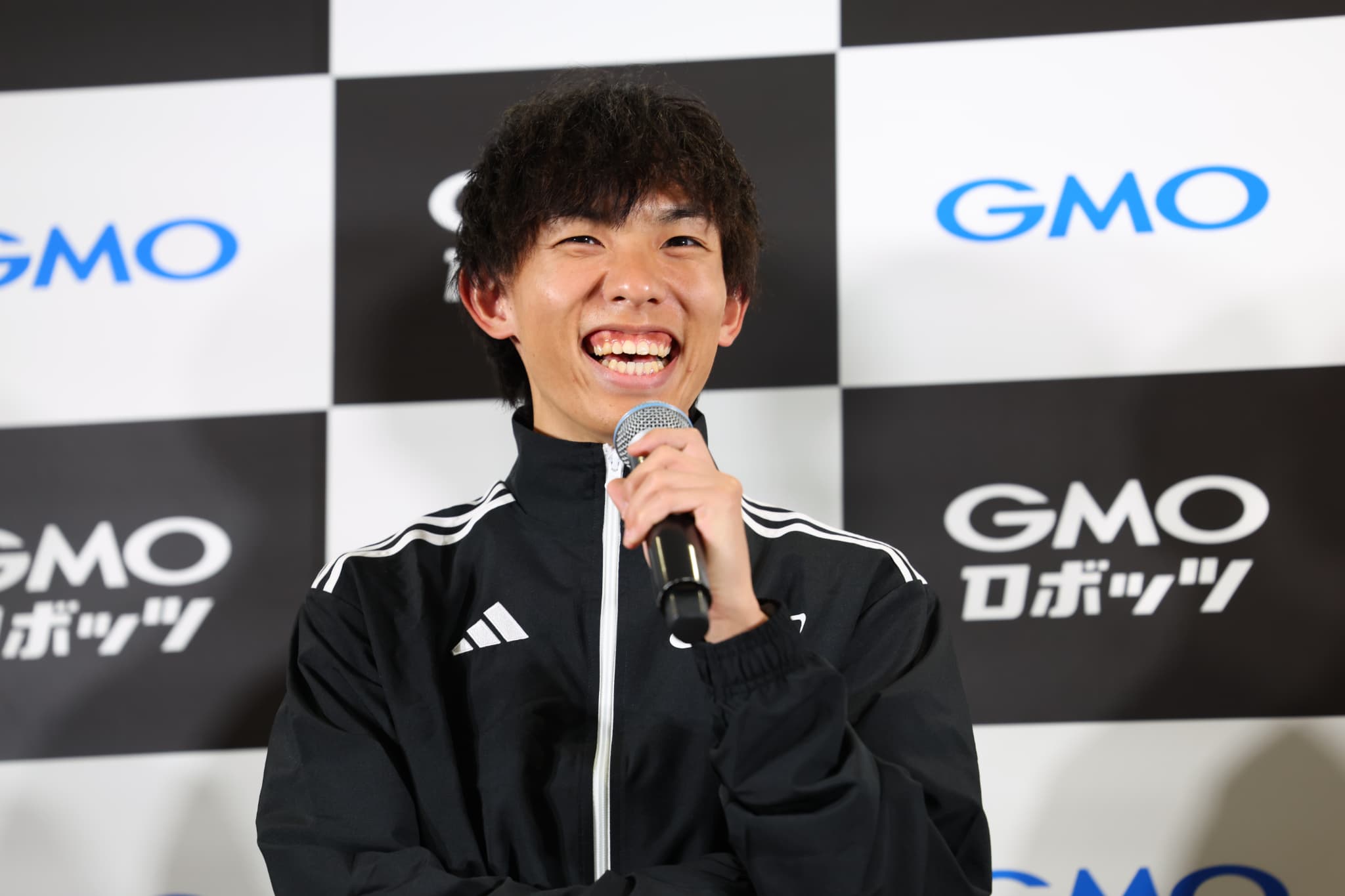 その一方で、選手たちの言葉には勝負への意識もしっかりありました。吉田選手は、「僕たちも駅伝に初出場した時は5番だった」と振り返りながら、今の技術力や熱意を結集すれば、ヒューマノイド競技会でも絶対に優勝できるはずだと語りました。黒田選手も、ヒューマノイドはこれからさらに進化して速くなるだろうと話しつつ、自身も今年GMOインターネットグループに入社して陸上部に加盟した一人として、「GMOインターネットグループ陸上部 – GMOロボッツ」に負けないよう進化し、チームのニューイヤー駅伝連覇に貢献したいと語っています。今江選手もまた、「GMOインターネットグループ陸上部 – GMOロボッツ」の新しい挑戦に携われることへのうれしさと、それが自分たちにとっても刺激になっていること、そして陸上部としてニューイヤー駅伝連覇に向けてしっかり活動していきたいという思いを言葉にしました。