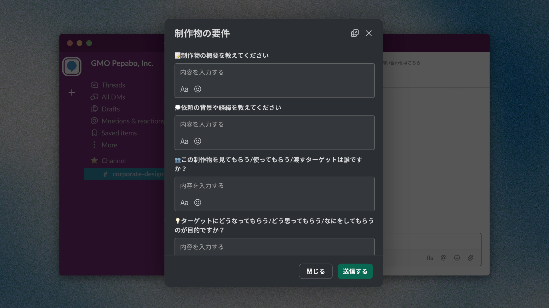 具体的には、Slackを依頼窓口とし、テンプレート入力だけで制作依頼が完了する仕組みを構築。また、制作前のオリエンテーションでは以下の4W1Hを用いて方針を明確化します。