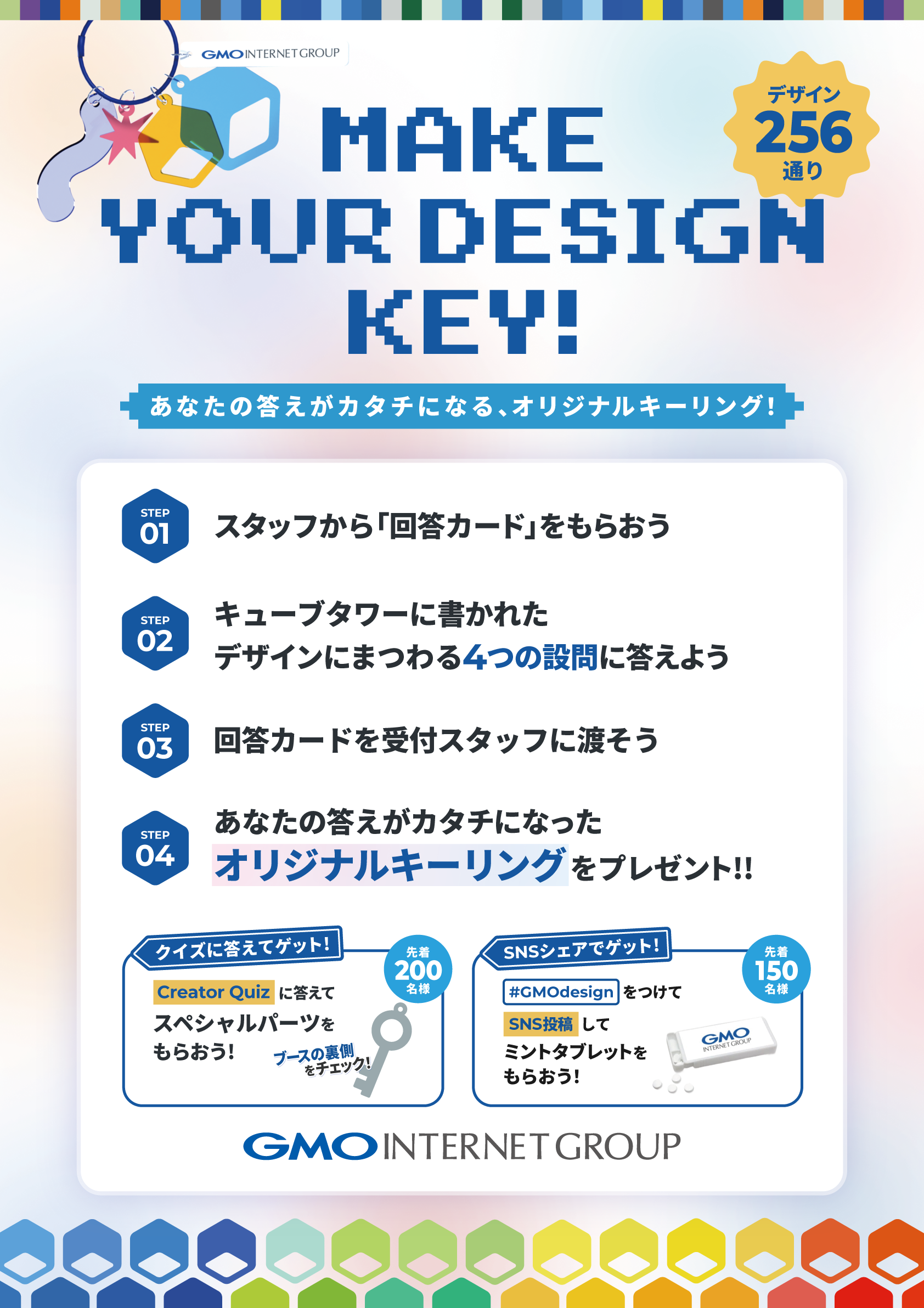GMOインターネットグループのブースでは、デザインにまつわる4つの問いに答えることで、256通りの組み合わせからあなただけのオリジナルキーリングが手に入る参加型企画を実施します。