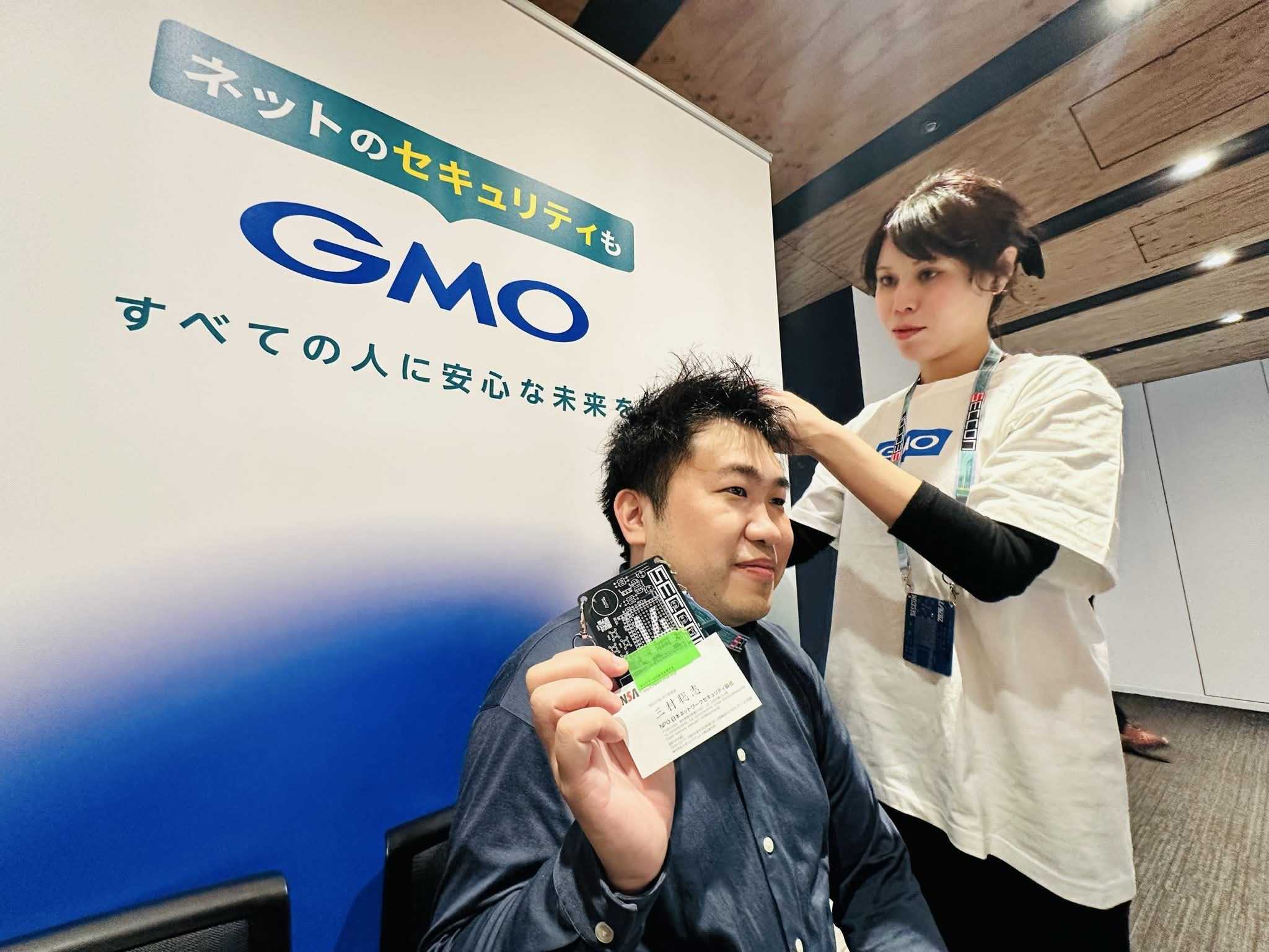 最後に筆者の会場の様子(?)としてスポンサーの GMOインターネットグループブースにおいて寝癖を治す私をおいておきます。