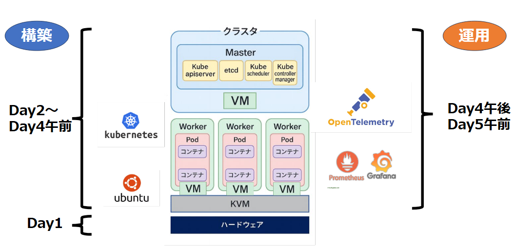 - 内容:実際に当社でも利用している Kubernetes クラスタ環境を、物理~仮想レイヤまで構築し、運用まで一貫して体験。体験により、当社における多様なインフラエンジニア職の役割や業務内容を理解できる構成とした。