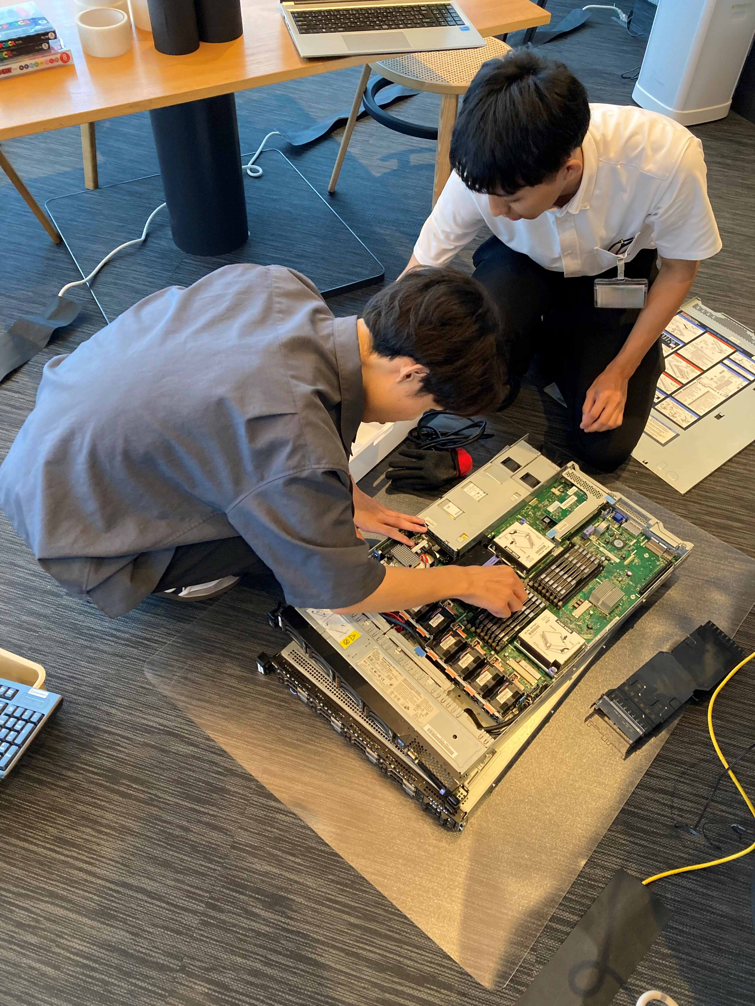 - クラウドネイティブ世代が多いことを踏まえ、あえて物理サーバの組み立てから実施。ハードウェアの仕組みや役割を理解したうえで、インフラの基盤を体感してもらった。当社は IaaS を展開しており、ハードウェア理解は必須のスキルであることを学習した。
