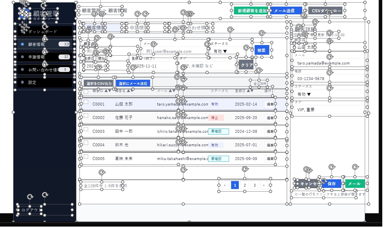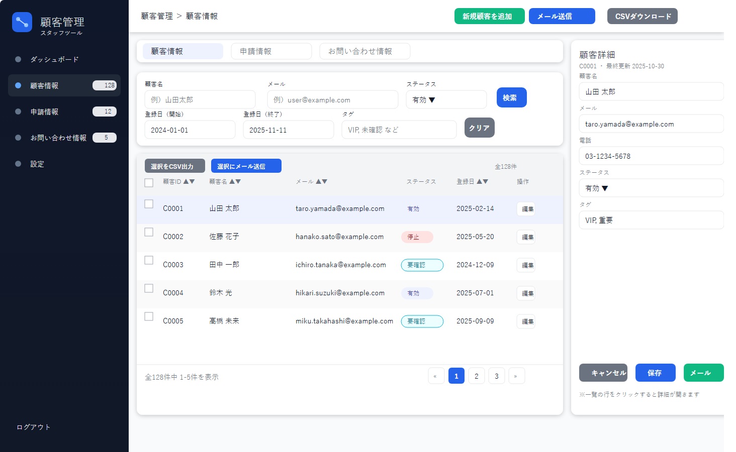・顧客情報、申請情報、お問い合わせ情報が管理されるアプリ