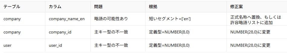 問題一覧(テーブル/カラム/問題/根拠/修正案)(2)の結果