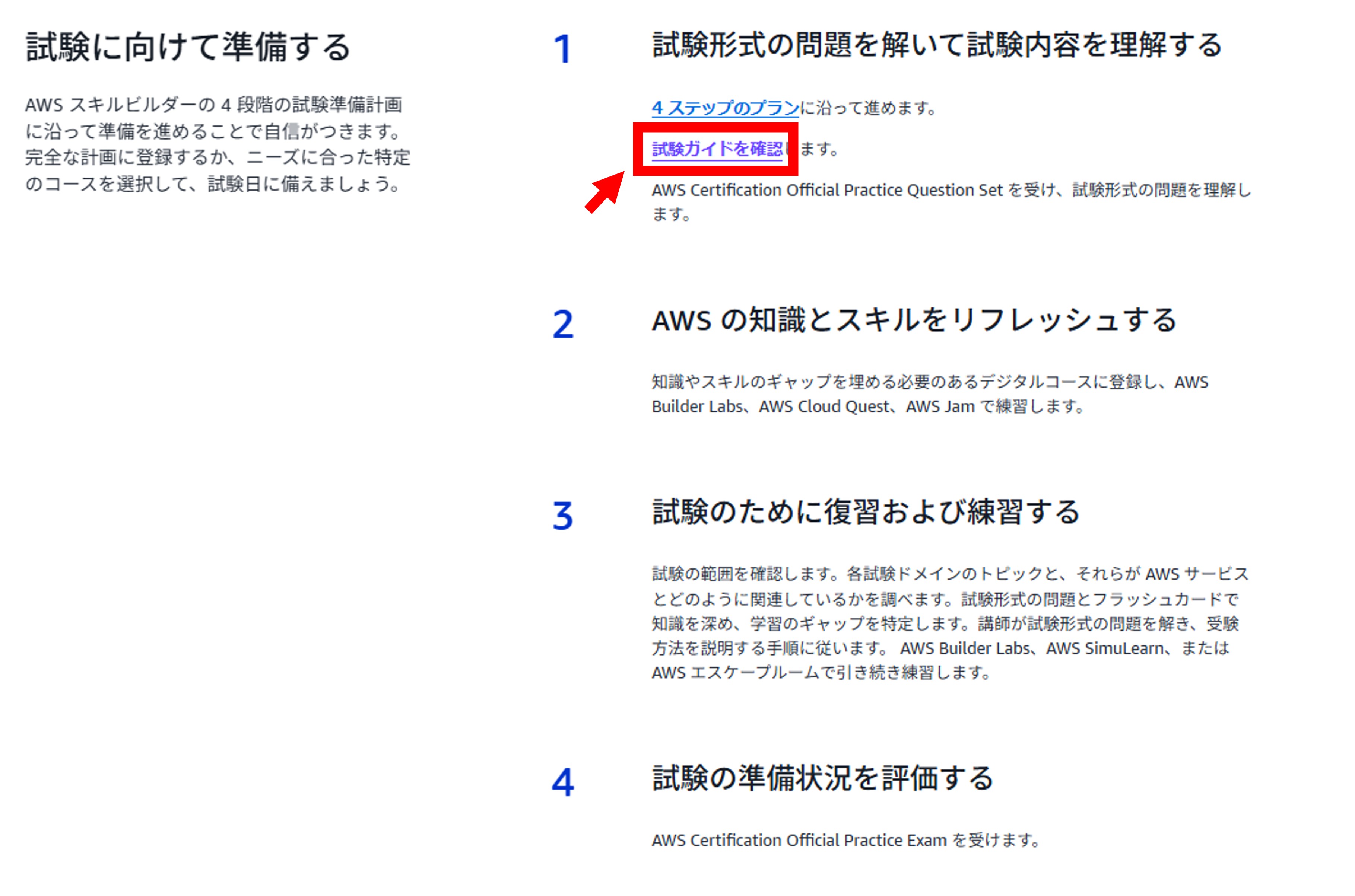 「AWS 認定試験に向けた準備」で試験に関する情報が見れます。まずは敵を知るところから。2、3分でさっと目を通すくらいで十分です。特に出題範囲の内のAWSサービスと機能はよく確認しておきましょう。