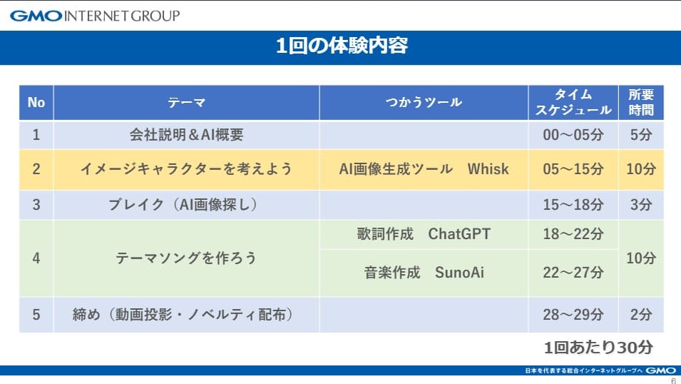 1コマあたりの体験時間は30分。限られた時間の中で、GMOインターネットグループの紹介や仕事内容への理解を深めていただくとともに、私たちが日常業務で活用しているAI技術に実際に触れてもらいました。子供たちがこれから成長してく未来において、AIは切り離せない存在です。体験を通じて、そのおもしろさや価値を感じてもらうと同時に、AIの脅威や使い方の注意点についても正しく伝えるコンテンツを構成しました。
