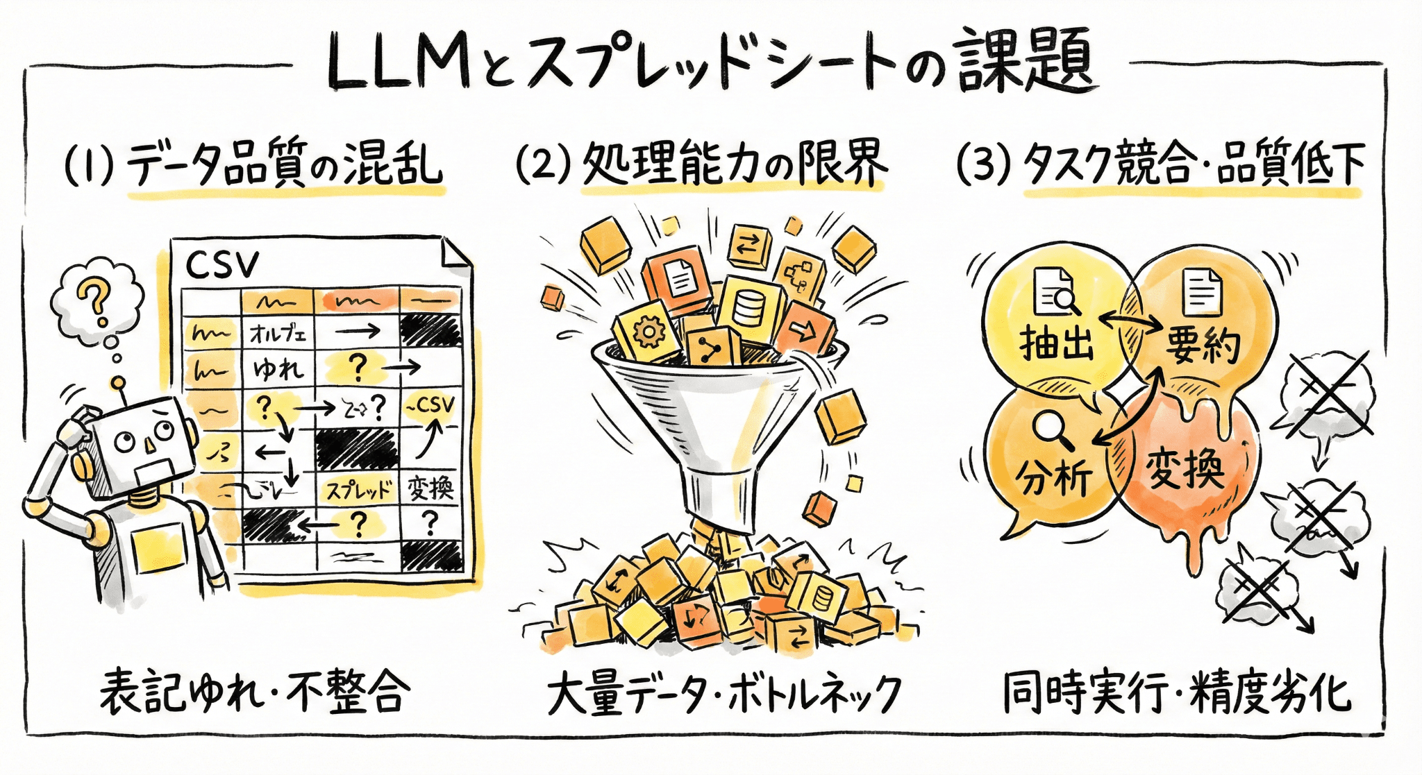 LLMは自然言語処理が得意ですが、構造化されたデータ(特にスプレッドシート形式)を正確に扱うのは実は苦手です。いくつかの理由があります。