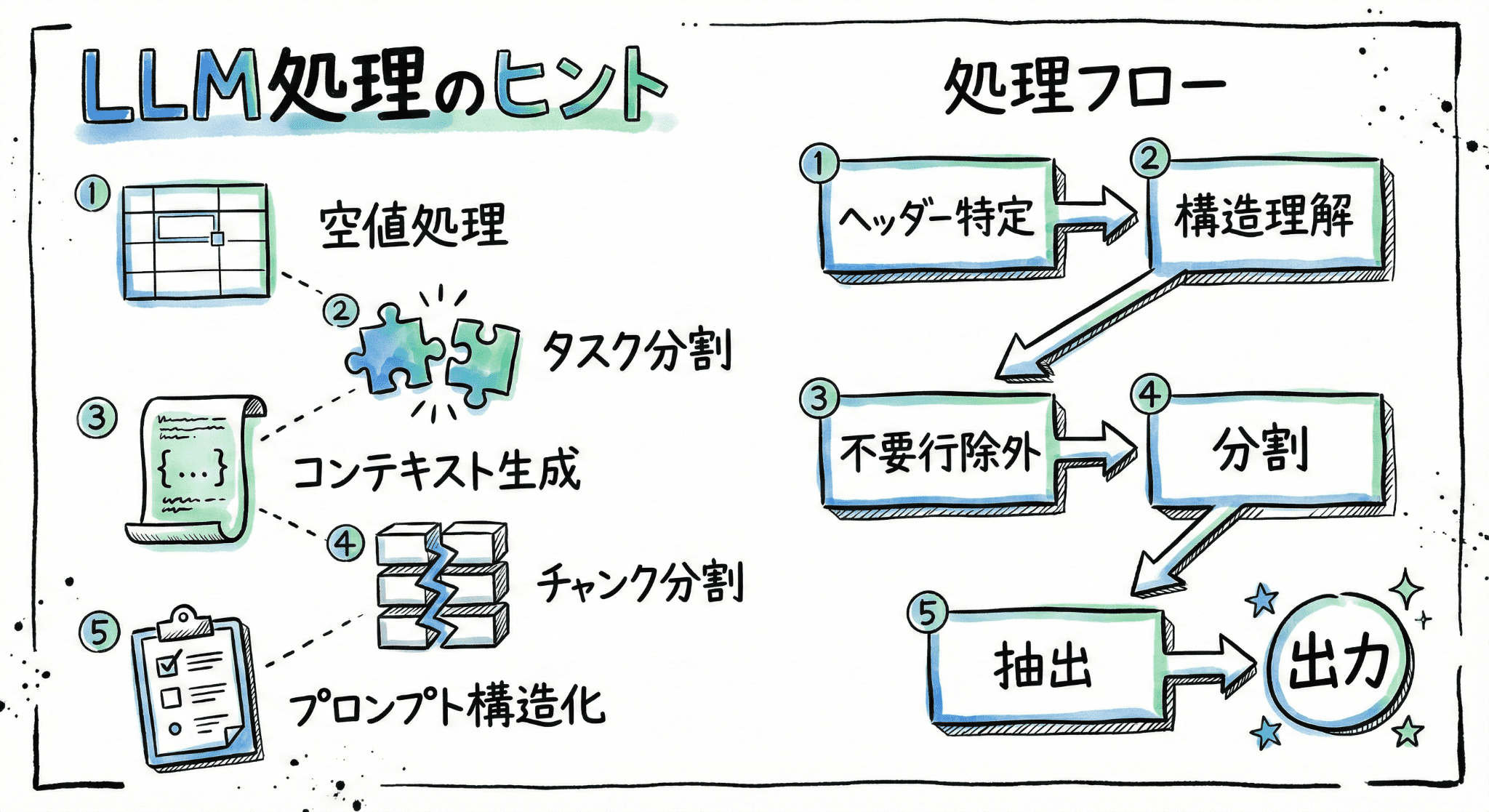 一見、シンプルに「LLMにExcel/CSVを渡して『このデータを抽出して』と頼めばいいだけでは?」と思われるかもしれません。結論から言うと、それだけでは全然うまくいきませんでした。