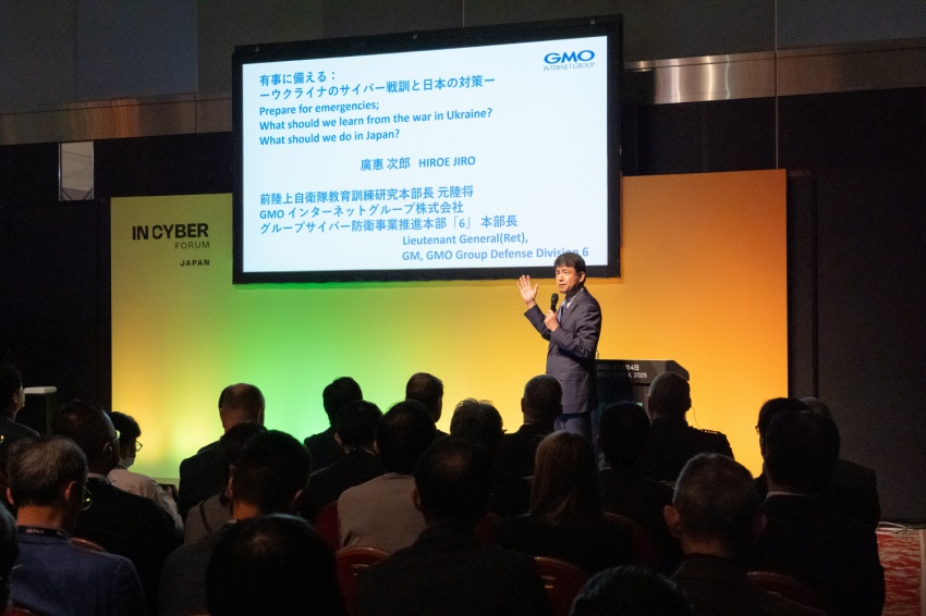 続いて登壇したのは、GMOインターネットグループ株式会社 グループサイバー防衛事業推進本部「6」本部長であり、前陸上自衛隊教育訓練研究本部長・元陸将の経歴を持つ廣惠次郎。ウクライナへの訪問経験に基づき、軍事的視点からサイバー戦の実態と日本への教訓を語りました。