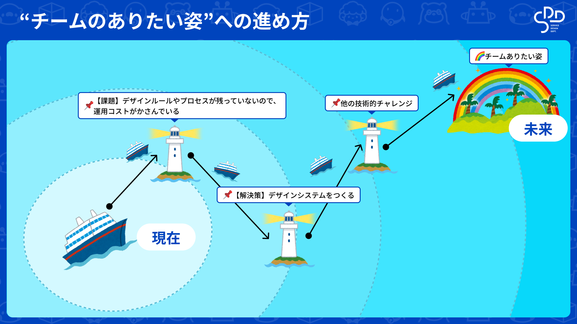 例に上げた課題の場合、「新しい技術を取り入れている状態(ありたい姿)」を目指している過程で解決できそうです。デザインシステムの構築やアトミックデザインの導入を一緒に進めながら、一緒にドキュメント整備もできます(逆にありたい姿の過程で解決できないものは、タイミングを図る必要があります)