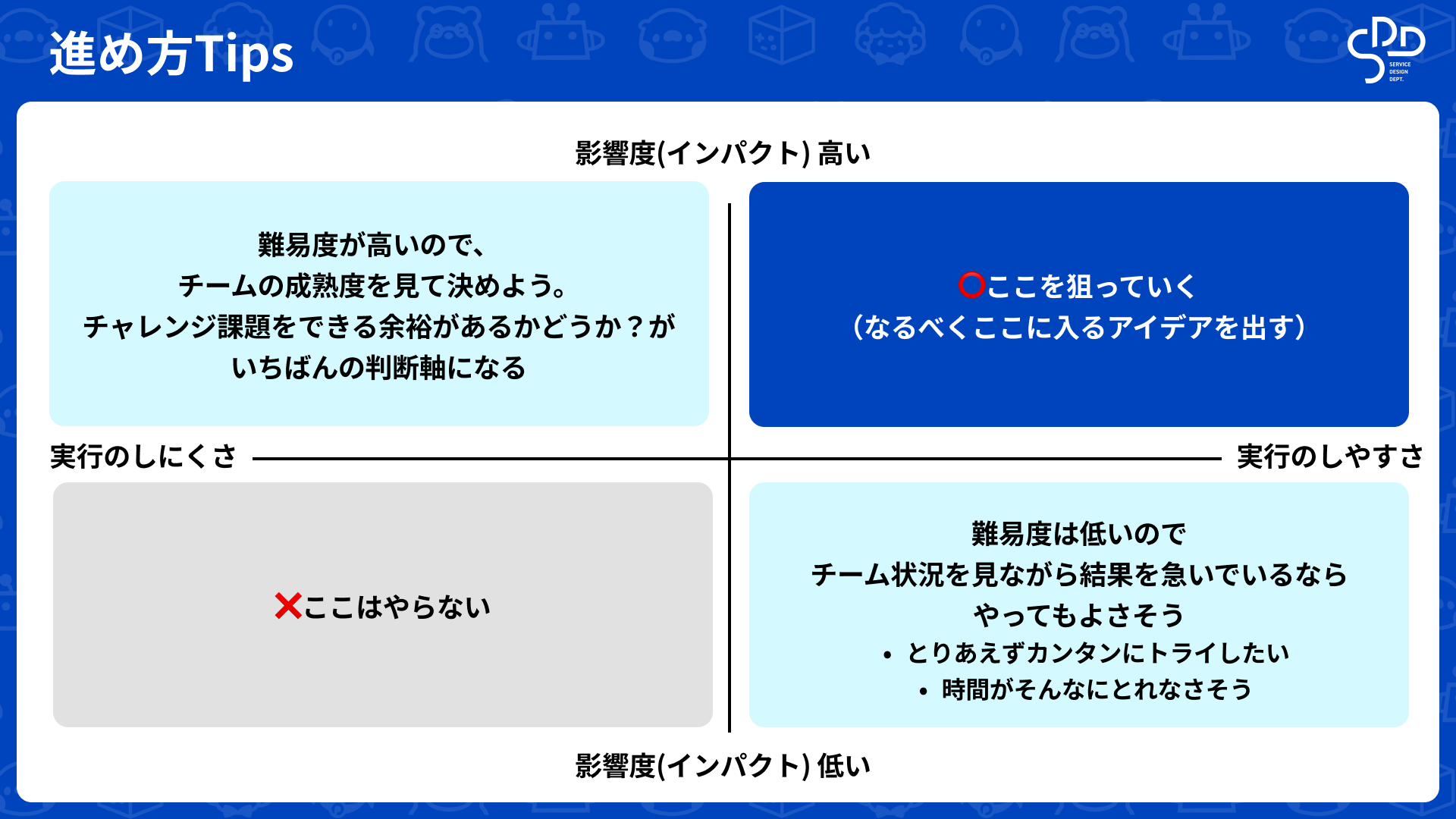 • インパクト大 × 実行しにくい: チームに余裕がある時にチャレンジする。