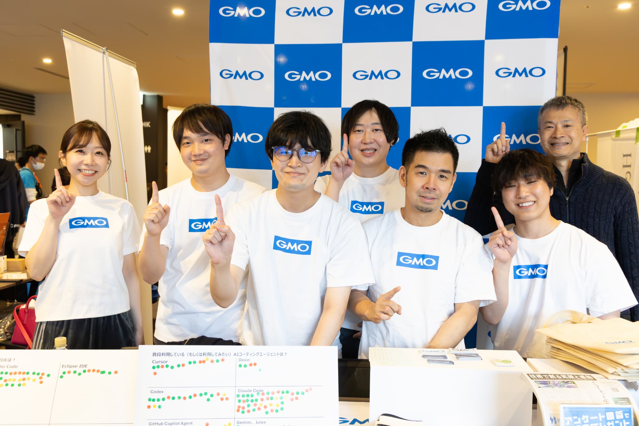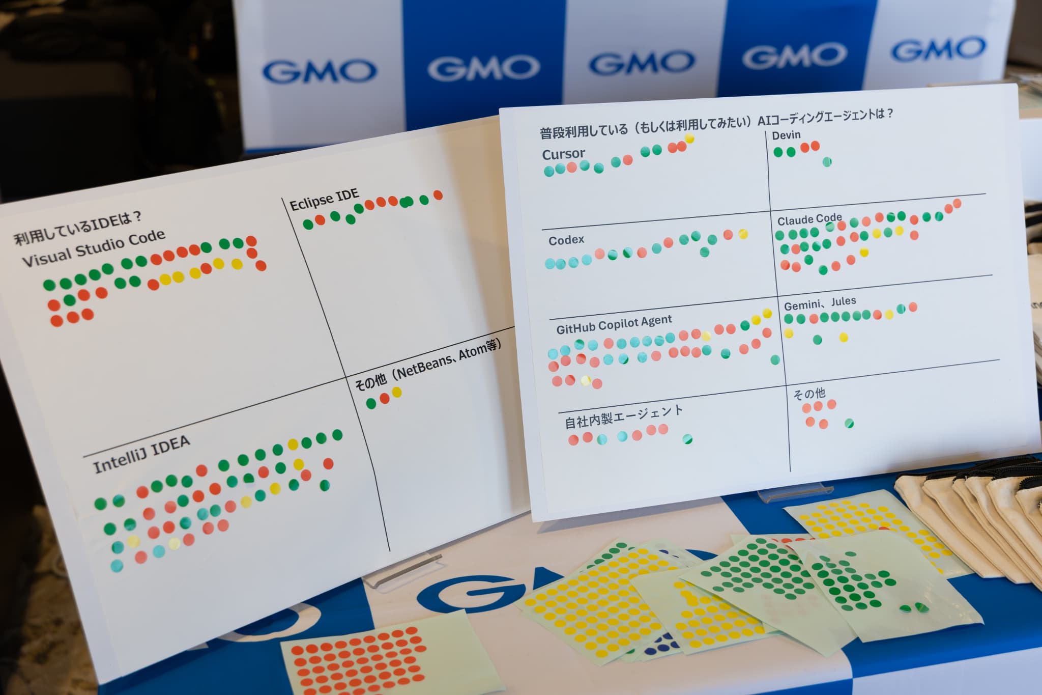 また、ポストイット形式で「皆さんがお使いのIDEは?」「どんなAIツールを使っていますか?」というアンケートも実施。これをきっかけに参加者との交流が多く生まれました。ブース担当の奥山貴大さん(GMOペイメントゲートウェイ株式会社)は「新卒からずっとGMOペイメントゲートウェイ株式会社に在籍しています。出展を通じて、他社のエンジニアが何を考えているのか直接聞ける機会はとても貴重です」と笑顔を見せました。