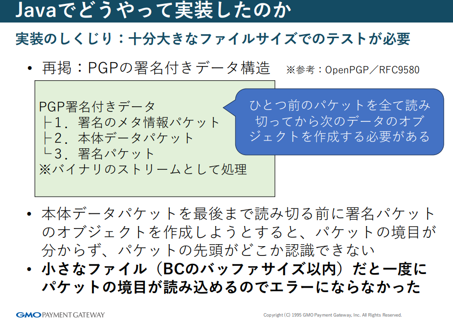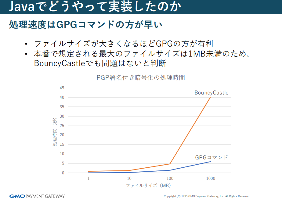 この2点から BouncyCastleを採用する判断に至ったと言います。「逆に、日常的にGB級のファイルを処理するワークロードであれば、GPG方式が適している」と前川さんは補足しました。