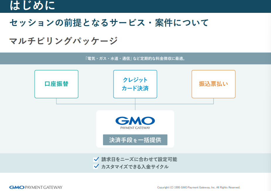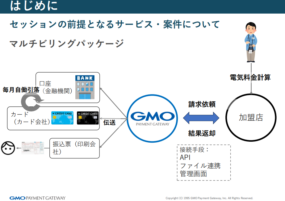 続いて、今回の話題の前提となる案件についても説明がありました。前川さんが携わっているのは、電気・ガス・水道などの公共料金事業者向けに複数の決済手段を提供するマルチビリングパッケージ。