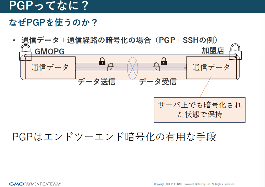 「なぜPGPを使うのか」に関して、前川さんはSSHとの比較を用いて説明します。SSHのように通信経路のみを暗号化する場合、通信中のデータは守られますが、サーバー上に保存されるデータは平文のままです。そのため、サーバーが侵害されると情報が漏洩する可能性があります。