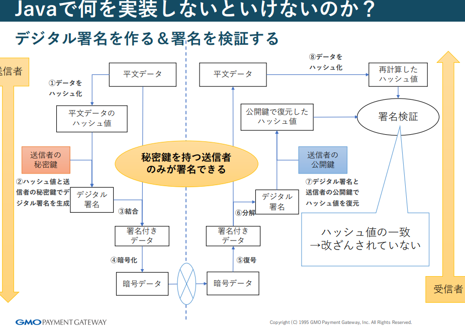 前提知識を踏まえ、セッションは「Javaで何を実装するのか」へと進みます。PGPで用いられるデジタル署名やハイブリッド暗号方式の仕組みを整理しながら、その処理をどのようにJavaとして落とし込んでいくかが解説されます。