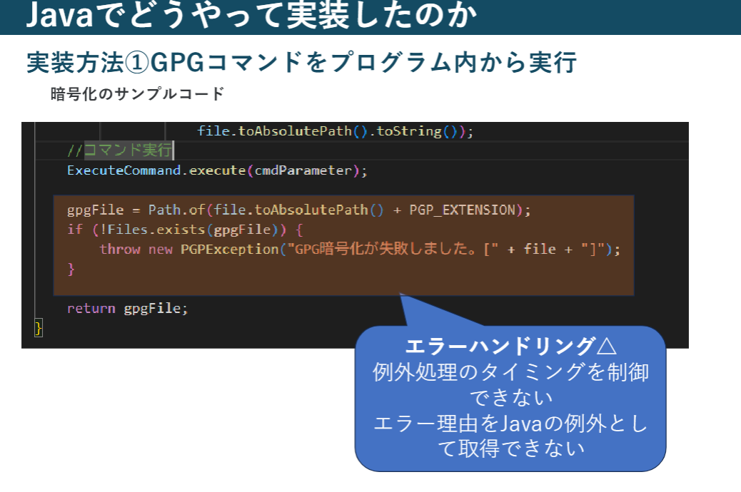 • GPGが返す結果は「ファイルが生成された / されない」で判定するため、エラー理由がJava側で例外として取得できない