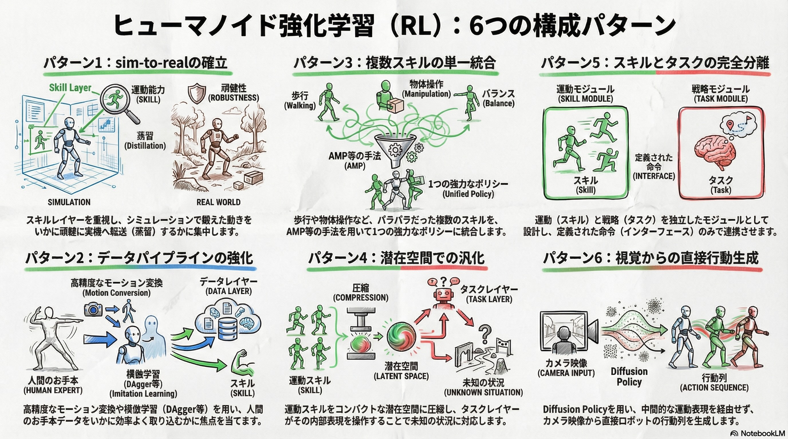 初期のヒューマノイドRLは「人間のモーションをいかに正確に再現するか」が中心でしたが、BeyondMimicやULTRAに見られるように、スキルレイヤーで獲得した運動能力を潜在空間に圧縮し、タスクレイヤーが未見の動きへの汎化に活用する流れが生まれています。これはパターン4(潜在空間での汎化)の核心思想であり、「模倣はゴールではなく、スキルレイヤーの土台を作るための手段」という認識が分野全体に浸透しつつあります。