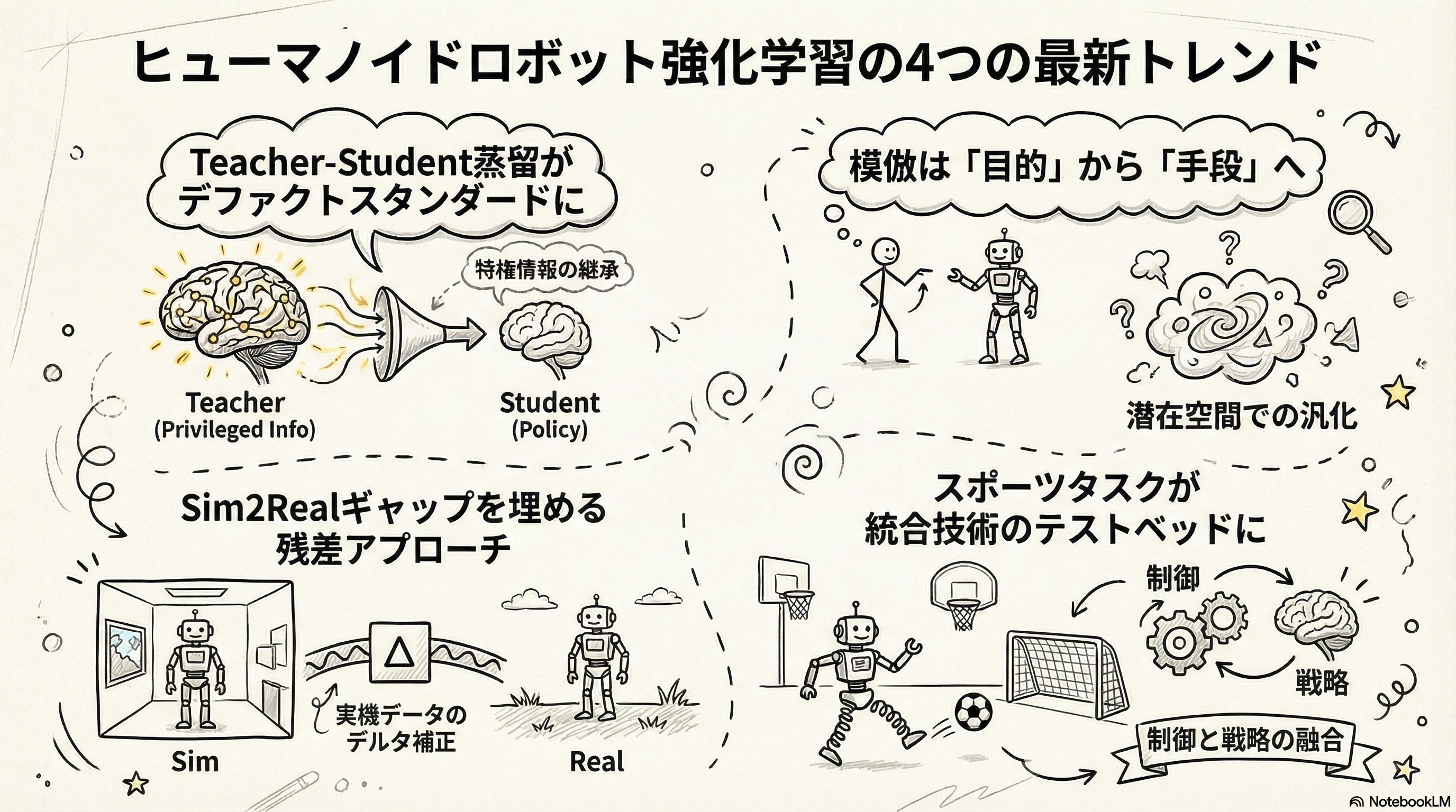 HOVER、VIRAL、OmniH2O、ExBody2、PHCなど、sim-to-realを伴うほぼ全ての手法がTeacher-Student学習を採用しています。シミュレーション内の特権情報で教師を訓練し、実機で使えるセンサだけで動く生徒に蒸留するこの手法は、スキルレイヤーの訓練・転送における設計原則として、パターンを問わず広く共有されています。