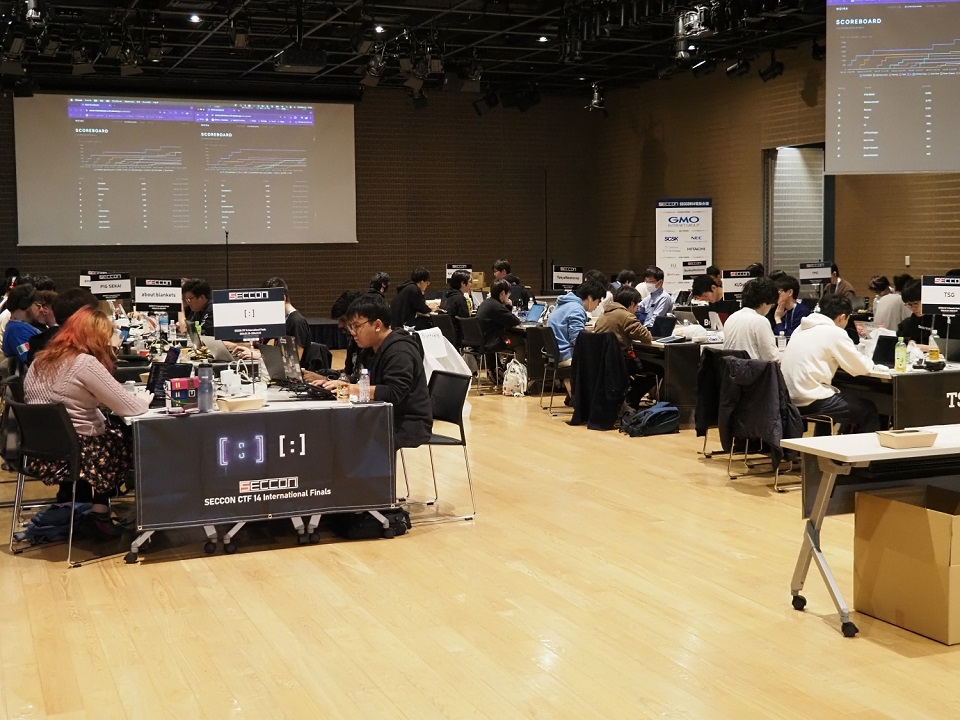 2階ヒューリックホールでは、世界規模のオンライン予選を勝ち抜いた国内外のチームが覇を競う「SECCON CTF 14 International Finals」「SECCON CTF 14 Domestic Finals」が開催されました。